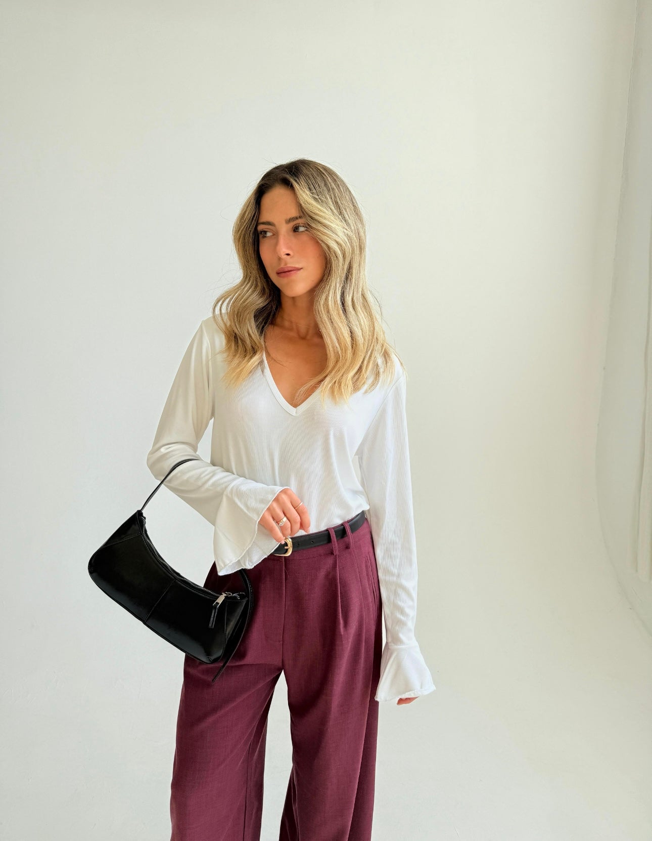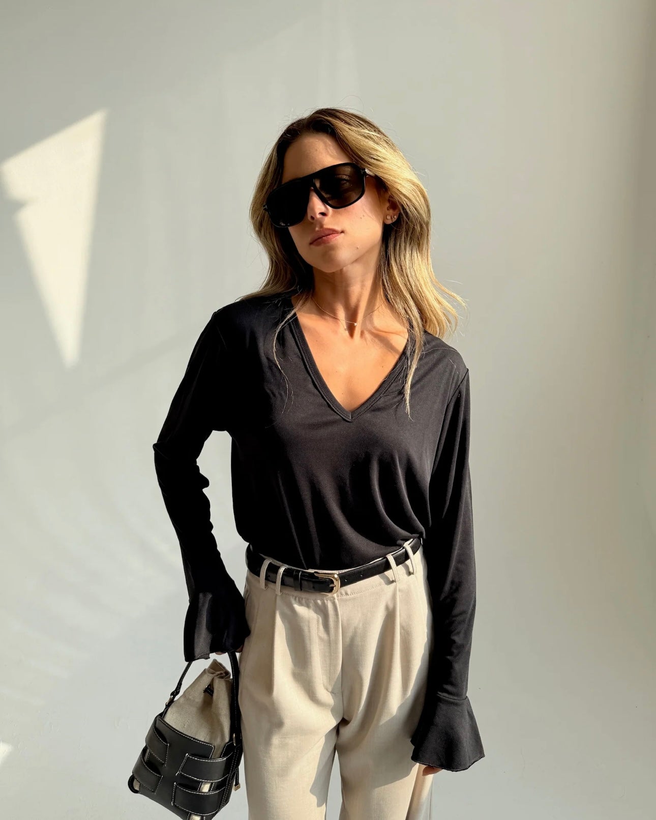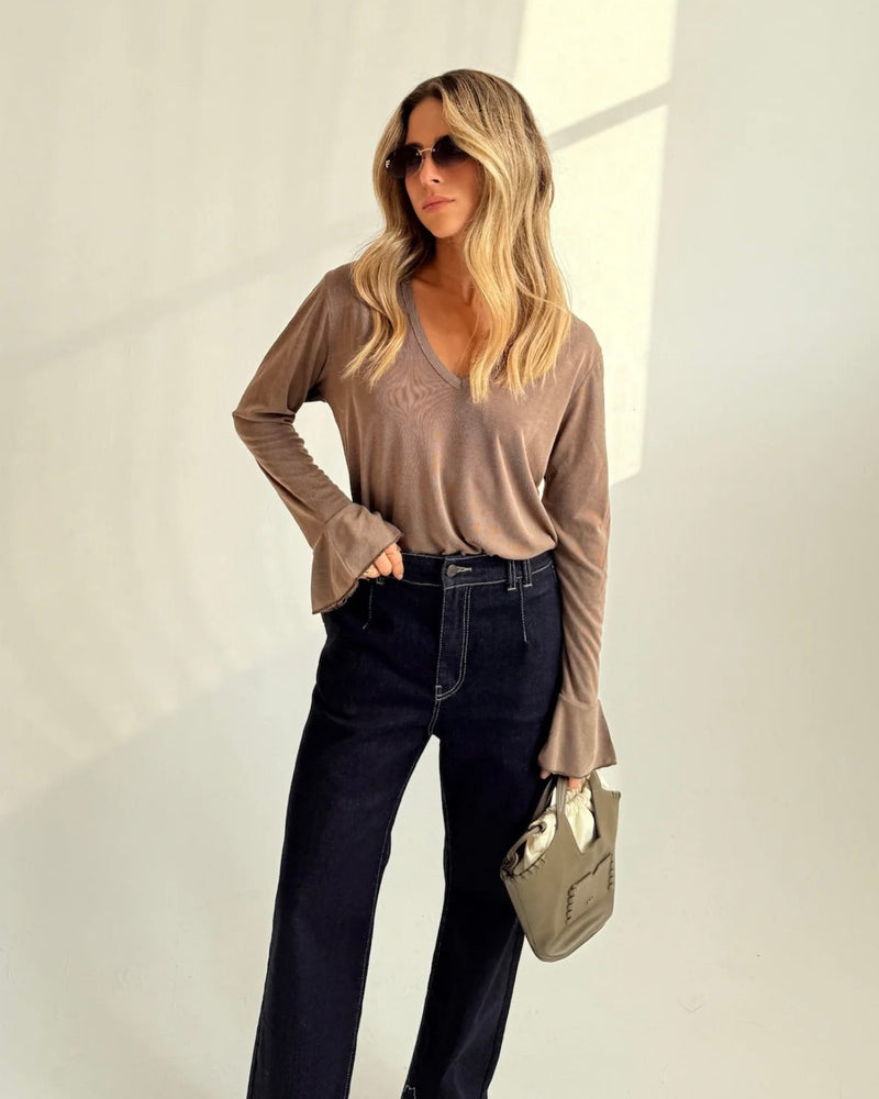 חולצה ארוכה מבד מודל רך ונעים, עם מחשוף ווי ושרוולים מתרחבים למראה אלגנטי ונינוח